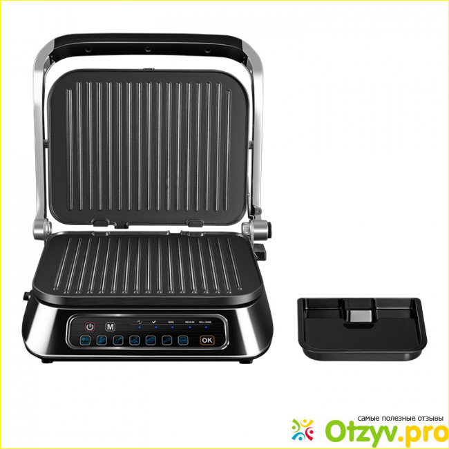 Если вы на гриле готовите что-то с подливкой или во время жарки скапливается много жира, то он собирается в специально встроенный поддон внизу. Ни одна капля жира не попадает на стол. Чтобы вытащить поддон, нужно его просто потянуть, там нет никаких кнопок. Моется поддон очень легко под проточной водой.