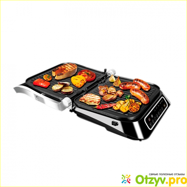 В электрогриле имеется 7 автоматических режимов: подогрев, курица, рыба, стейк, сосиски, бекон, бутерброды.