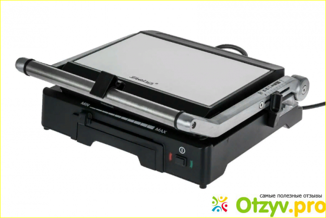 К сожалению здесь не предусмотрены защита от скачков перенапряжения, но благо, что есть защита от перегрева, также сам корпус обладает термоизолированными свойствами. Справа от основания рукоятки располагается переключатель положения крышки гриля, Также на корпусе вы сможете найти 2 кнопки, которые открывают фиксирующий пластины замок.