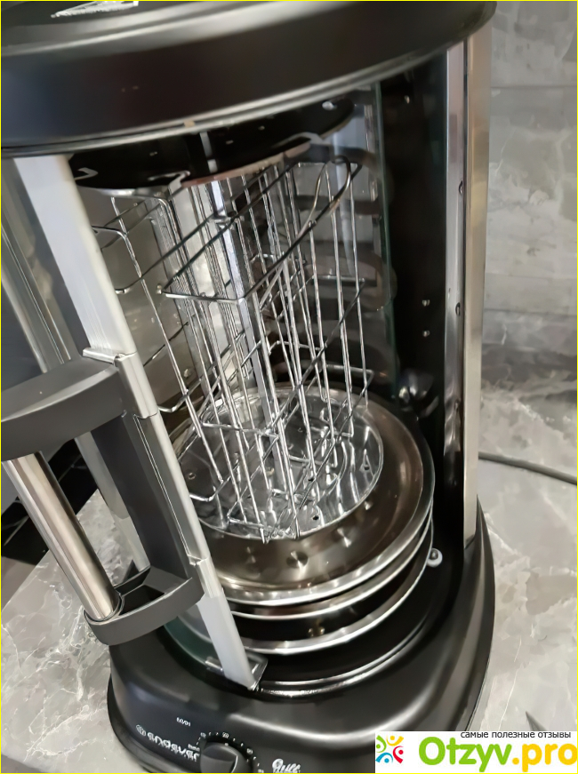 На первоначальной взгляд этот аппарат может показаться похожим на обычную электрошашлычницу, но не всё так просто. С его помощью можно не только делать простые шашлыки, но и запекать курицу-гриль, различную рыбу и овощи, готовить экзотическую для наших широт шаурму или кебаб. В целом такой аппарат должен расширить кулинарные изыски любого любителя готовить мясные и не только мясные блюда.