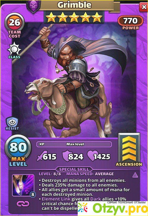 Фиолетовые моноцветы заиграют сильнее за счёт способности связи стихий. Если есть только регулярные герои или четвёрочки из Атлантиды, то Гримбл будет надёжным товарищем.