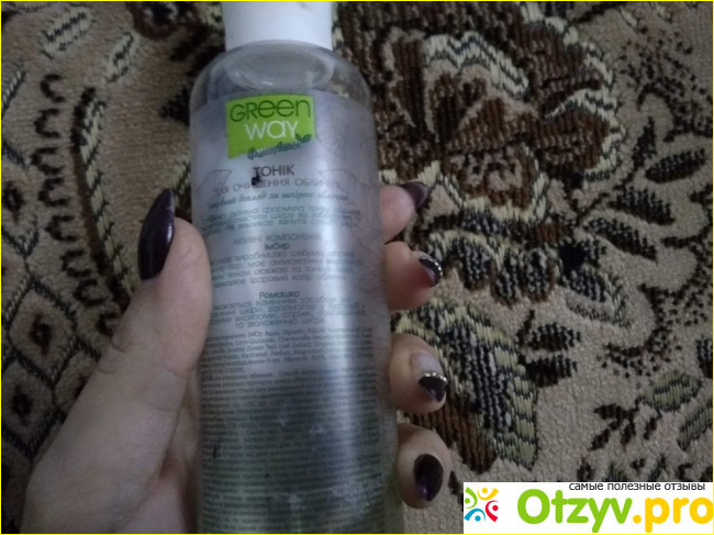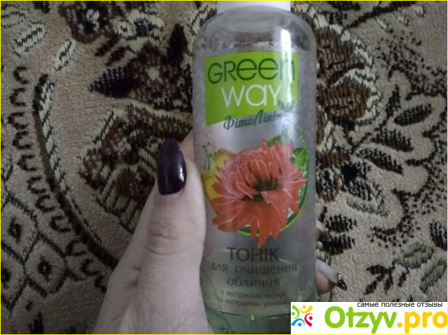 А этот продукт я использую несколько раз на день. Только проснувшись и умывшись водой, я беру ватные диски грин вей и тоник. И ими продолжаю очищать и тонизировать свою кожу. Лицо и шею, область декольте я тонизирую с помощью этого средства. После чего она приятно пхнет, увлажнена и готова к дальнейшим манипуляциям. Касаемо лица и шеи – сверху наношу тональный крем. Он ложится ровным слоем. А все это благодаря тому, что перед тем было тонизирование. Поверьте, без тоника такого эффекта просто не добиться. Или нужно наносить дорогостоящие крема, но зачем? Когда есть недорогой и качественный продукт. Для моей кожи я выбрала средство с имбирем и ромашкой. Есть у фирмы подобные товары для сухой и комбинированной, жирной и нормальной кожи. Так что каждый может подобрать себе свое средство. Мне идеально подходит это. У него приятный аромат свежести. А утром это немаловажный фактор. Я не могу наносить в раннее время на свою кожу сильно ароматные и пряные средства, начинается рвотный рефлекс. От этого тоника наоборот только приятные ощущения и эмоции.