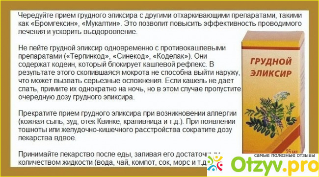 Очень полезный грудной эликсир детям младших возрастов, которые максимально неуязвимы во время сезона простуды. Как только заметили у ребенка кашель, сразу же нужно приступить к лечебным процедурам. Лучше запастись несколькими флаконами, так как расход у препарата довольно существенный, правда стоит лекарство в аптеках сущие копейки. Грудной эликсир пользуется широким спросом, поэтому далеко не в каждой аптеке можно его обнаружить.