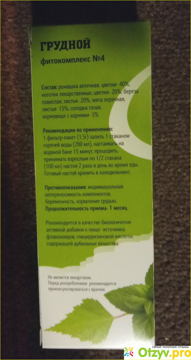 Эффект от сбора № 4 хороший. Уже на третий день я начинаю откашливаться. А дней через 10 я забываю о простуде. Конечно, я сочетаю средства: как правило, использую данный сбор вместе с сиропами и таблетками.