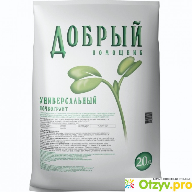 Россия. Грунт Добрый помощник универсальный, 20 л. Артикул: 539. Полностью готовый питательный грунт на основе верхового сфагнового торфа для выращивания, пересадки однолетних и многолетних овощных, ягодных, плодовых и цветочных культур, а так же для ландшафтного озеленения. Обеспечивает получение полноценной рассады, стимулирует корнеобразование и развитие растений. Производится из высококачественного верхового торфа, природных минеральных компонентов, содержит в своем составе полный набор макро- и микроэлементов питания в оптимальных соотношениях. Срок годности не ограничен.