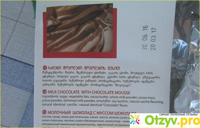Для этой цели на каждой коробке шоколадных конфет, десертов и на упаковке каждой плитки шоколада содержится информация о качественном составе продукта и сроках его производства. Примечателен именно тот факт, что данная информация представлена сразу на трех языках - русском, английском и, собственно, на грузинском. Это очень удобно как для русскоговорящих покупателей, так и для зарубежных покупателей.