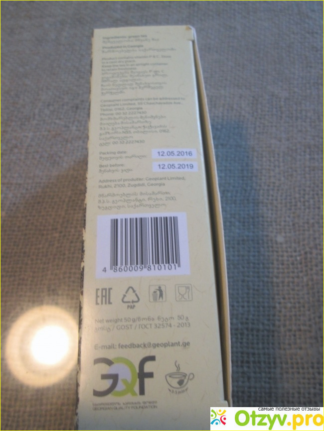 Срок годности мне понравился - аж три года. Даже у чаев из Вьетнам и Лаоса он иногда бывает всего год, хотя может быть это и к лучшему, вдруг чай как-то обработали, чтобы он долго хранился? Сделан на чайной фабрике в Зугдиди и там же рядом выращен