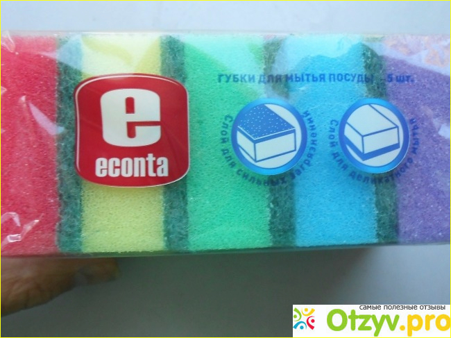 Губки состоят из двух слоев - поролонового для деликатного мытья посуды, например, сковородок с тефалевым покрытием, и абразивного слоя для удаления трудно выводимых загрязнений. Собственно, у губок всех производителей так и есть, но только зачастую абразивный слой после 1-2 применений начинает отслаиваться от поролона, что очень неудобно. А в губках Econta такой проблемы нет, абразивный слой у них прочно закреплен. Но самым главным достоинством этих губок я считаю их невысокую цену, благодаря чему можно безболезненно для семейного бюджета часто менять эти губки на новые, разумеется, того же бренда. Какими бы удобными они не были, в целях гигиены их необходимо менять как можно чаще, ведь на них неизбежно скапливаются микробы, бактерии, вирусы и даже грибки, устойчивые к различным моющим средствам. А если губки недорогие, то не жалко их менять чаще.