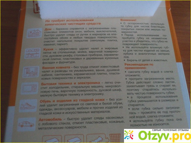 На этикетке была подробно описана инструкция. Перед применением необходимо намочить губку в воде, отжать между ладонями и начать работу. Никакие чистящие средства, гели и порошки использовать нельзя! По мере использования губка будет стираться, чернеть и уменьшаться в размерах. Точно как ластик. В конце концов она разлохматиться и покрошится.