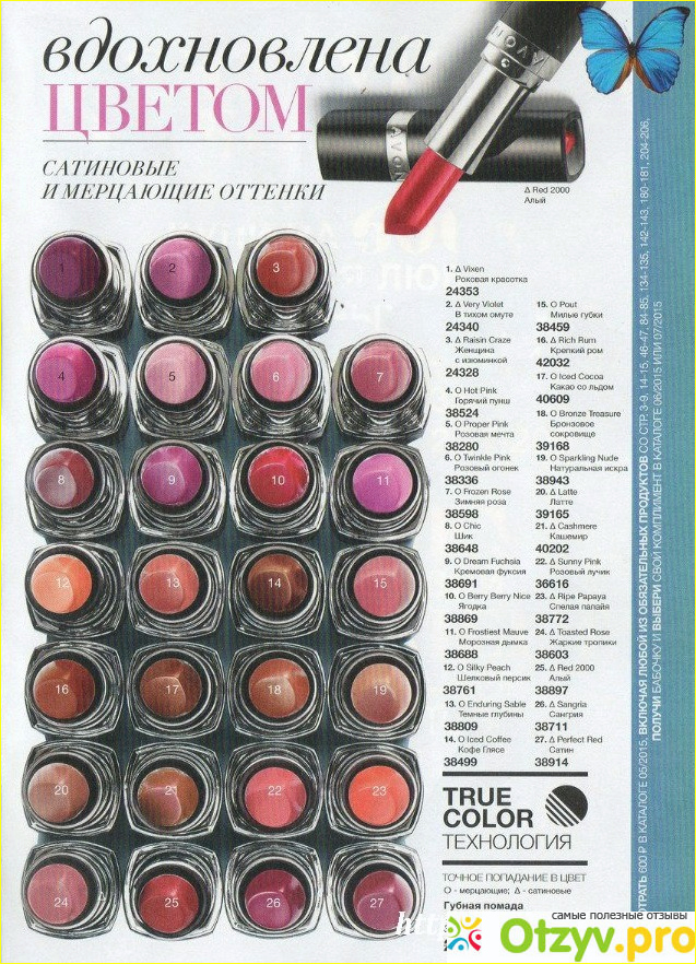 Эта помада увлажняет губы, в составе есть масло авокадо. Оттенков много, можно выбрать на каждый день, и на праздники. Помада не сушит губы, и долго не стирается.