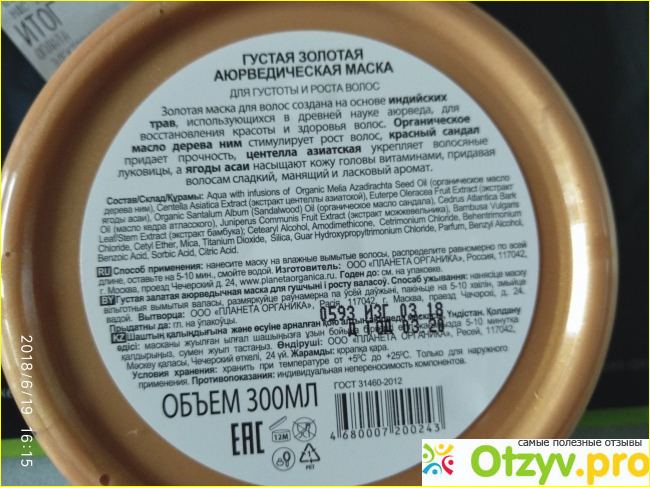Уже дома прочитала аннотацию на дне банки. Досталась мне "Густая золотая аюрведическая маска" для густоты и роста волос - это именно то, что я и хотела.