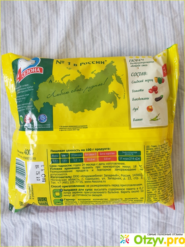 На упаковке продукта изображены яркие овощи. Они нарезаны крупно, но так и должно быть. На упаковке написано, что смесь быстрозамороженная. Большой плюс производителю. Шоковая заморозка - то, что нужно для производства готовых овощных смесей. Знаете почему? С помощью такого метода удается сохранить витамины и полезные вещества в ингредиентах.