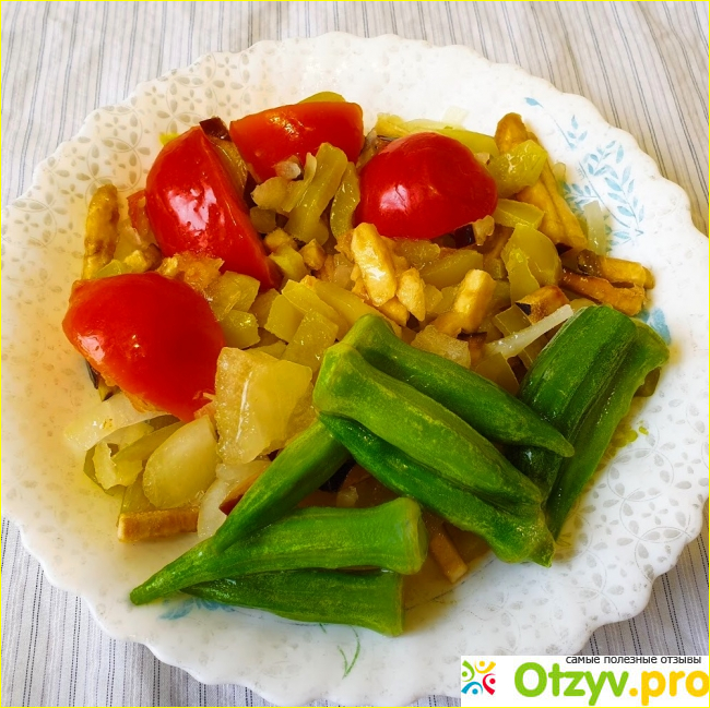 Внутри упаковки вот такие вот овощи. Обратите внимание на крупную, но при этом аккуратную нарезку. Выглядит вполне достойно. Стручки бамии придают блюду оригинальный вид. Эту смесь я рекомендую тем, кто хочет разнообразить свой рацион.