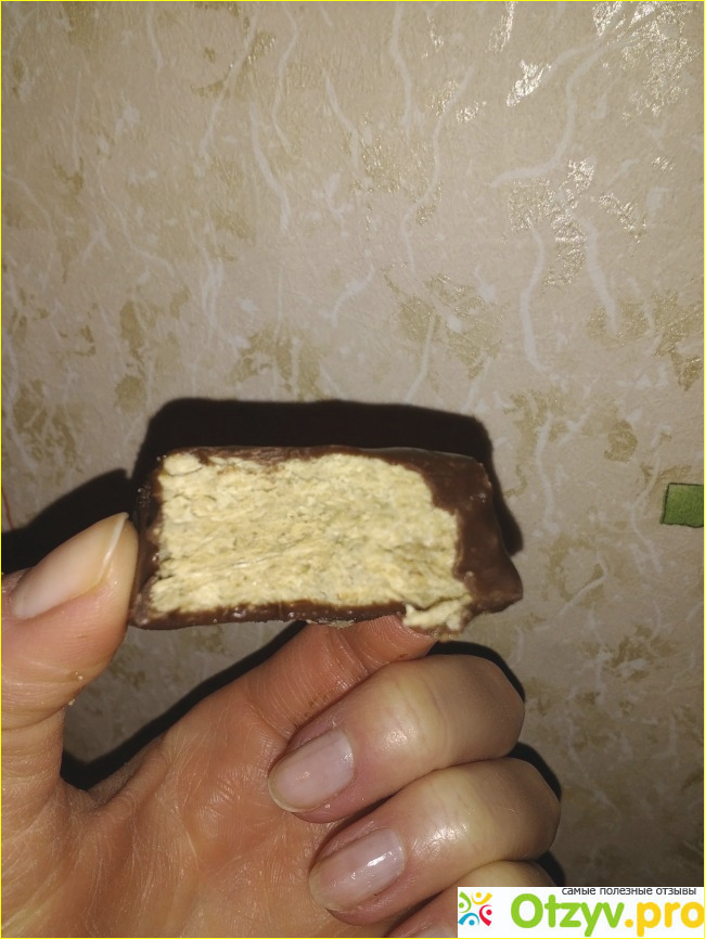 На следующей фотографии халва без упаковки. Смотрится не слишком аппетитно по причине того, что глазурь растаяла при соприкосновении с руками. Да ещё и сама халва крошится очень даже сильно, на мой взгляд.