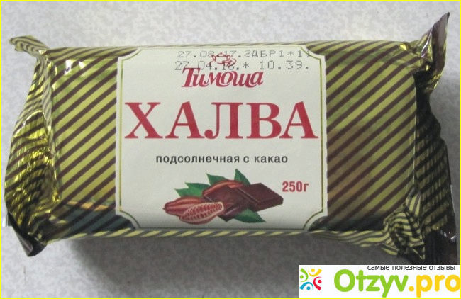 Халва подсолнечная с какао "Тимоша" - отличная халва, прекрасно подойдет к чаю или утреннему кофе. Изготавливает халву "Тимоша" известный пищевой комбинат "Азовский", находящийся в г. Азов Ростовской области.