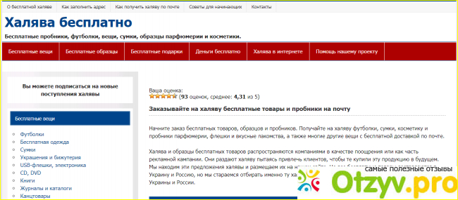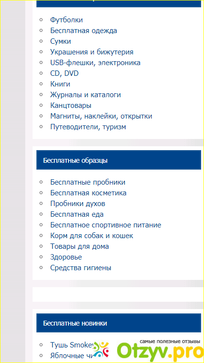 На главной страничке слева можно найти список бесплатных пробников, образцов и прочих вещей. Это футболки, кепки, канцтовары, сумки, бижутерия, косметические пробники а также еда, спортивное питание, корма для животных, товары для дома, средства гигиены и прочее добро.
