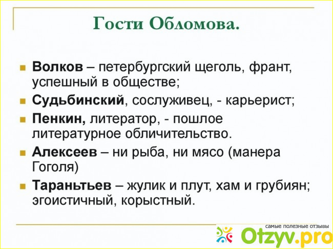 Так выглядит характеристика гостей Обломова. И хоть гости не похожи один на другого, у них мало сходства и с хозяином дома. Преследуя свои цели, каждый из гостей видит в Обломове возможность провести время с пользой для себя и не отпускают мысль самого Илью Ильича вывести в свет. Но им этого так и не удается сделать, а с Терентьевым так вообще, отношения испортились и превратились во вражеские.