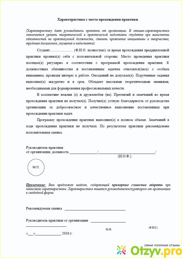 Пишется куратором учащегося. Зачастую практикант на просьбу написать ему характеристику, слышит такой ответ, "некогда". Что теперь будет? Неужели отчет будет незаконченным и неполным из-за отсутствия характеристики? Не расстраивайтесь. Ведь если руководитель ссылается на свою занятость, тогда у студента есть прекрасная возможность самому составить характеристику.