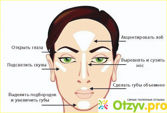 Хайлайтер. Используется только на отдельных частях лица для подчеркивания строения или скрытия недостатков, например, синих кругов под глазами.