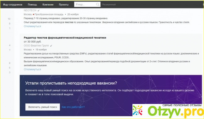 Я уже более чем полгода не пользуюсь данным сайтом, но мне до сих пор звонят на телефон и приглашают на собеседование. Чтобы немного ограничить компании к вашей кандидатуре, вы можете сразу же указать желаемую заработную плату, потому что работодатели сначала указывают одну заработную плату, а по факту оглашают вам сначала испытательный срок с ужасным окладом.