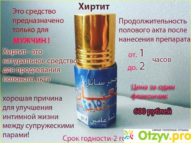 В положительных отзывах люди рассказывают, что Хиртит помог им вернуть нормальное семяизвержение и увеличить длительность полового акта. Мы с мужем надеялись на положительный результат и получили его. Цена на Хиртит составляет от 600 рублей за флакон. Препарат можно приобрести только в интернете, в аптеках его нет. Хиртит производится по египетским рецептам, которые использовали фараоны для повышения потенции.