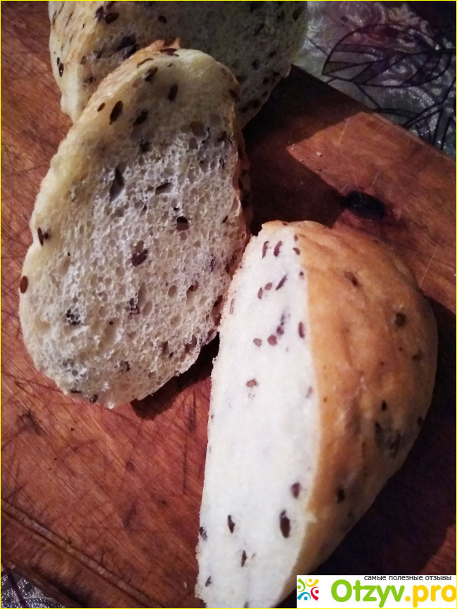 В булке 300 грамм, довольно большая на вид. Упаковано в целлофан со всей нужной информацией на нём. Выглядит красиво, особенно зёрнышки. Конечно, лён полезен. Аромат и вкус непосредственно хлеба не впечатлил, напомнил хотдожную булочку. Пресный, никакой вкус. Слышу запах дрожжей, что вообще не нравится. Льна не пожалели, зёрна крупные, ощущаются во рту когда жуёшь.
