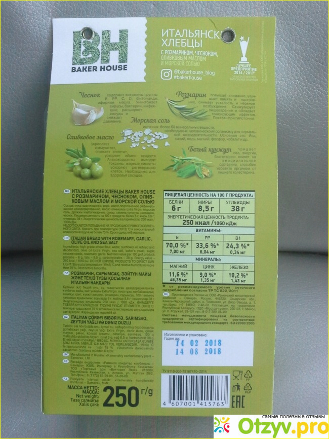 Решила попробовать что-то новенькое. Остановила свой выбор на итальянских хлебцах с розмарином, чесноком и оливковым маслом. О пользе всех добавок расписано прямо на упаковке. Калорийность вполне нормальная для такого продукта - 250 ккал на 100 г. Вес всей упаковки 250 г, она вполне объемная и увесистая.