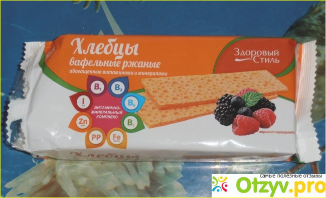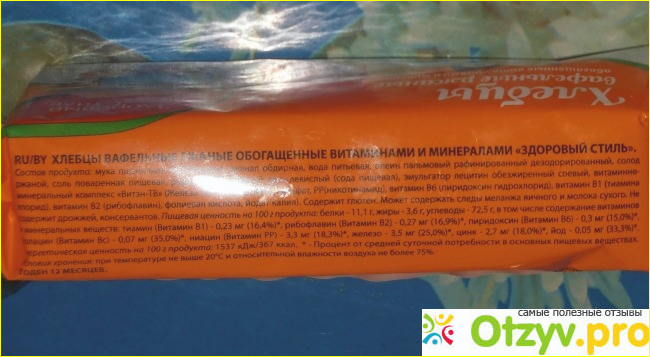 Также на лицевой стороне упаковки есть данные о том, какие витамины входят в состав данного продукта. Эти вафельные хлебцы содержат комплекс витаминов группы В, железо, цинк, йод и прочие витамины, то есть продукт по идее планируется как натуральный и полезный для здоровья.