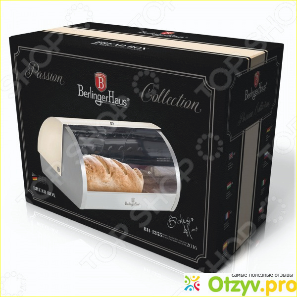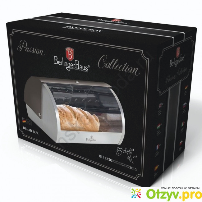 Цвет у хлебницы действительно очень интересный и красивый. А сама она продается в хорошо запакованной коробочке на которой вы как раз можете посмотреть что она из себя представляет. Коробка оформлена довольно строго в принципе как и вся продукция от торговой марки Berlinger Haus.