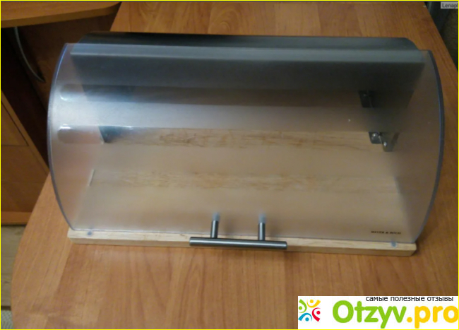Взяла европейское качество, известный бренд — хлебница mayer&boch mb-21217. Нашла такую в интернет магазине, на фотографии было то, что мне нужно — вместо стали — дерево и прозрачный пластик. Значит, так надоевших мне отпечатков пальцев на хлебнице больше не будет.