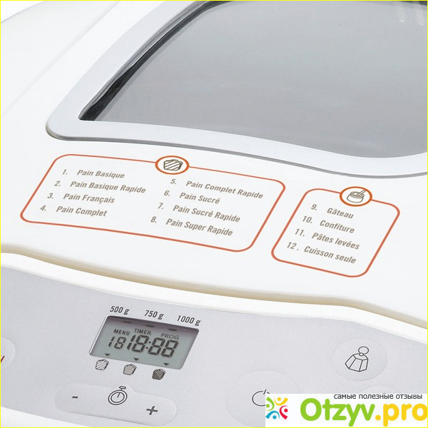 Управление хлебопечкой Moulinex OW200033 осуществляется мембранными кнопками, под пленкой, они не боятся влаги, обозначения кнопок можно прочитать в инструкции, но понятно и по картинкам: для выбора веса есть символ гири, символ "три корочки хлеба" - понятно для чего, символ секундомера и кнопки - и + - для установки таймера. Menu - выбор программ и кнопка вкл/выкл для запуска и остановки программы.