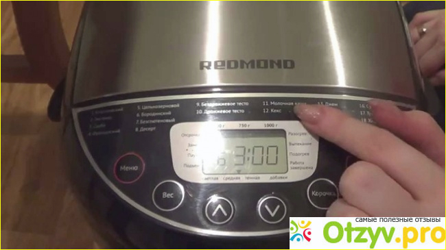 Дисплей на крышке в полной мере отображает все параметры процесса: время, номер программы (выбирается в меню), стрелочками задается вес буханки и цвет.