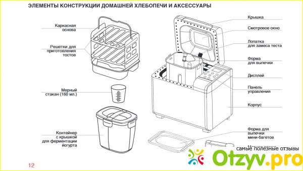 В комплектацию входит непосредственно сама печка, а так же мерный стакан, форма для выпечки мини багетов, две мерные ложки на 5 и 15 грамм, с помощью них легко и быстро можно отмерить нужное количество ингредиентов для теста. Есть две решетки для приготовления тостов и специальный контейнер с крышкой для приготовления йогурта. форма для выпечки хлеба в форме буханки, лопата для замешивания теста, каркас для установки форм для багетов и решеток для приготовления тостов и конечно же подробная инструкция с рецептами приготовления.