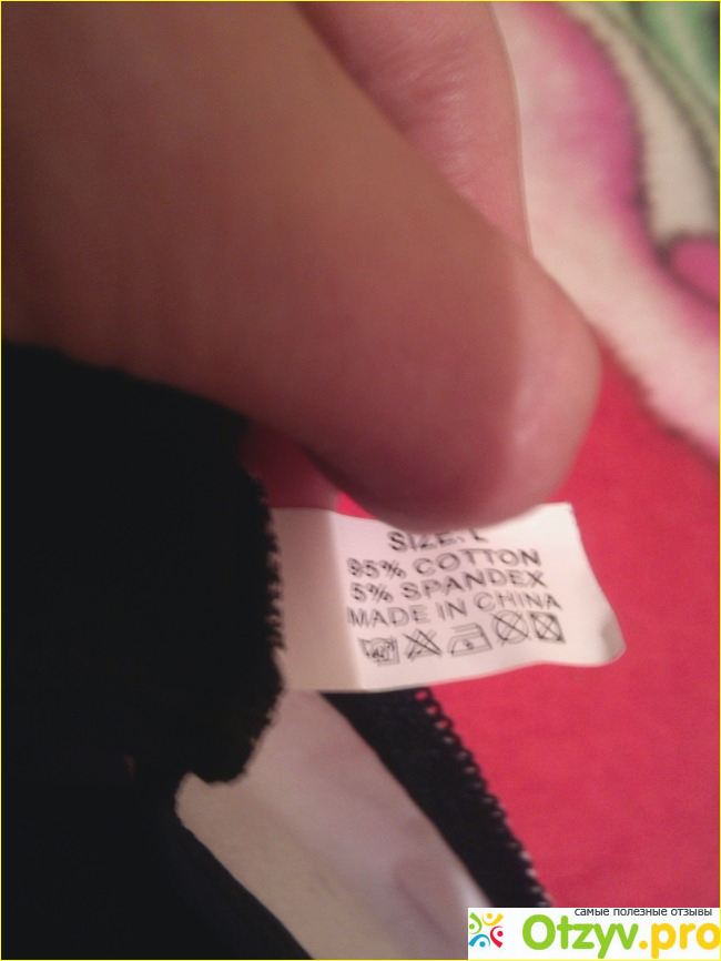 Состав ткани указан изнутри на ярлычке. Наличие помимо хлопка пяти процентов спандекса обеспечивает эластичность и более долговечную эксплуатацию изделия.