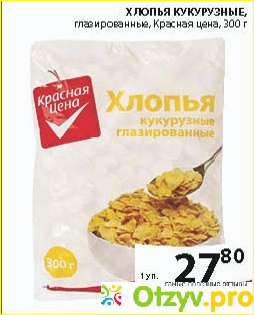 Стоят кукурузные хлопья "Красная цена" также как и шарики этой марки 37 рублей. Упаковка хлопьев оформлена так же, белого цвета, красная эмблема с названием марки, только вместо шариков изображены кукурузные хлопья. В магазине шарики и хлопья рядом лежали, в одном отделе, так что искать особо не приходится.