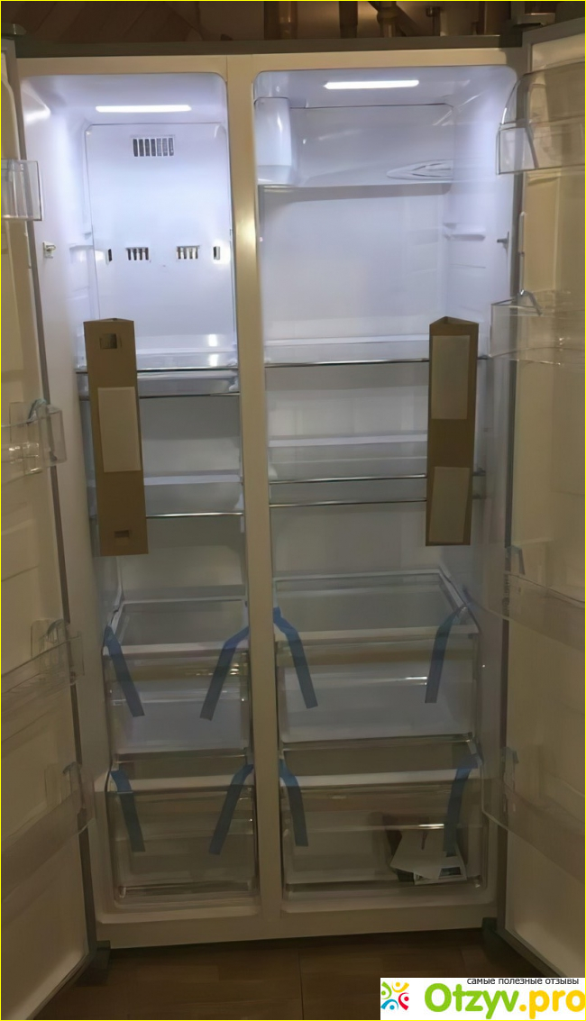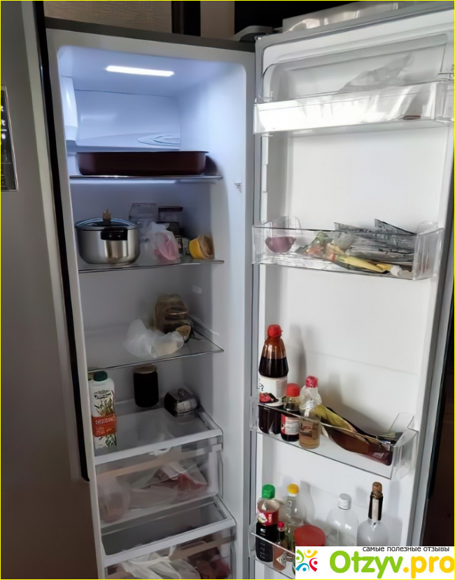 К этой фирме у нас нет особых претензий. Это конечно российский бренд, но естественно выпускается всё в Китае, странно, если было бы всё по-другому. Вообще штука функциональная и стоят гораздо ниже чем 2 холодильника по отдельности. Нам он обошелся в 31 500 рублей с доставкой. Приобретали примерно год назад, теперь можно составить полноценное впечатление от покупки. За такую цену 2 обычных холодильника не купишь, а так выглядит очень стильно и красиво. Морозильник очень крупный, вместительность просто поразительная! Написано, что можно в морозилку впихнуть до 10 килограмм продуктов, но у нас умещалось и все 12-13 килограмм. Тут конечно главное уметь впихнуть. Правда, как и у всех морозилок есть один минус, если что-то ищешь, то потом впихнуть это обратно уже сложнее. Пока выгребешь половину, чтобы найти потом обратно, так что всегда надо учитывать это и не распихивать всё вперемешку. Обязательно поделите морозильную камеру по зонам. Отдельную для овощей, отдельную для фруктов, отдельную для быстрых заморозок, и то, что требует долговременного хранения. Холодильник очень удачный и работает негромко. Даже в жару не особо напрягается и не шумит. Если отпустить дверцу, то не захлопывается громко, стоят доводчики. Так что в целом компания выпускает идеальный холодильник для семьи, которая любит умеренные заготовки.