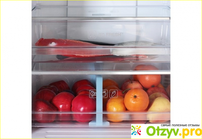 В холодильной камере предусмотрена зона свежести, желательно туда складывать ту пищу, которую вы едите в настоящий момент, чтобы она не потеряла свои вкусовые качества. Имеются ящики для хранения овощей и фруктов. Полки стеклянные, их тут достаточно. На дверной части также имеются полки для хранения бутылок, различных принадлежностей, имеется лоток для яиц. Объем холодильной камеры составляет 278 литров, таким образом общий V=368 l. Также по системе Ноу Фрост размораживается отсек. Что касается производительности, то техника способна замораживать до 12 килограммов в сутки продуктов, что считается довольно неплохим показателем.