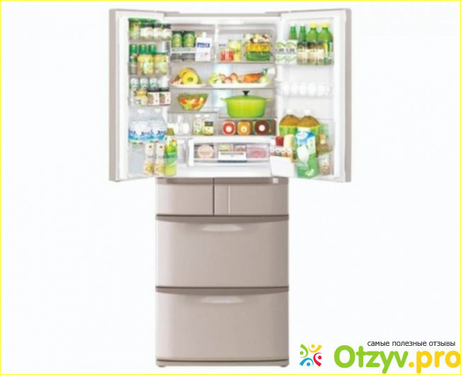 Я начала разыскивать подходящий товар и в онлайн-каталоге М-видео наткнулась на холодильник марки Hitachi R-SF48 EMU T. Прежде чем заказывать его, я решила съездить и проверить его работу, посмотреть, так скажем, на него. В первую очередь меня привлекла цена - 179 тысяч рублей, как раз укладывались в наш скромный бюджет. Во-вторых, по габаритам он не такой уж и большой (181.8*68.5*64.3 см), но при этом имеет много камер хранения. Это удобно, так как овощи, мясо, молочные продукты и т. п. могут храниться в разных местах, не впитывая запах друг друга. Да и хозяйка уже знает, что да где лежит, не приходится хлопать дверками без конца.