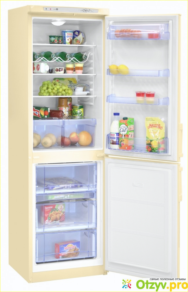 У нас холодильник бежевый, но белые варианты тоже продают. Выглядит обычно, стандартно я бы даже сказала, ну холодильник, что с него взять то, стоит себе в кухне, в интерьер вписывается. Тьфу-тьфу уже больше года работает вообще без проблем. Еще ни разу не размораживали, хотя работает на полной мощности (морозилка -18 градусов.) и льда так и не намерзло, что я считаю показателем хорошим. Запахи тоже не появились никакие, продукты хорошо хранятся, свежесть сохраняют, стенки внутри холодильника цвет не поменяли, повреждений тоже никаких. Все пластиковые ящики, а точнее, из морозилки, поддоны под овощи, полочки на дверце холодильной камеры, все целое, хотя некоторое даже ронялось на пол. Морозилка в этой модели расположена снизу, что для меня лично удобно, так как чаще всего мое семейство ныряет именно в холодильную камеру, а она расположена на такой высоте, что трехлетка не может ее открыть и оставить, а он у нас со старым холодильнике так делать очень любил (это и была причина поломки, собственно) Кстати, эта модель довольно высокая, 186 см., а потому довольно вместительная, для большой семьи идеальное решение, всем советую!