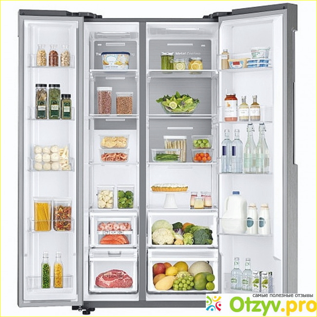 Так как у нас холодильник имеет две дверцы, соответственно огромное количество полок на дверной части, холодильная камера содержит также ряд полок из стекла, ящики для хранения овощей и фруктов. Морозильная камера расположена в данной модели холодильника снизу, что очень удобно и имеет выдвижные ящики приличного объема. Общий же объем холодильника Samsung RS62K6130S8 составляет 620 литров, из них на морозильную камеру приходится 214 литров, а на холодильную камеру - 406 литров. Один раз он, когда уезжал в командировку, обесточил полностью оборудование, а продукты попросту пропали. Небольшая вонь от пластика стояла, но после обработки химическими средствами этот запах пропал.