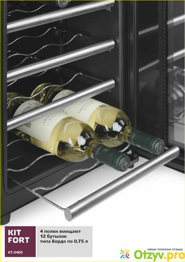 Дверцу шкафа сделали прозрачной, в верху имеются сенсорное управление со светодиодным экраном. Понравилось то, что она настройка температуры очень удобная, можно выставлять необходимые показатели используя шаг в 1 градус. При этом следует помнить, что разные виды хранятся при разной температуре, которая будет оптимальной для каждого конкретного напитка. Например, игристые вина лучше хранить при температурном диапазоне от 7 до 9оС, белые сухие вина оптимально хранятся при температуре от 13 до 15 градусов выше нуля, красные сухие вина хранятся при более высокой температуре под 17 до 18оС, температура хранения легких красных вин составляет в пределах 13 градусов, крепленые вина, белые и красные хранятся при температуре от 16 до 18оС, наконец, сладкие десертные вина, а также вина ликерного типа следует хранить при температуре 18 градусов выше нуля. Эти факторы следует обязательно учитывать, когда вино размещается в шкафу.