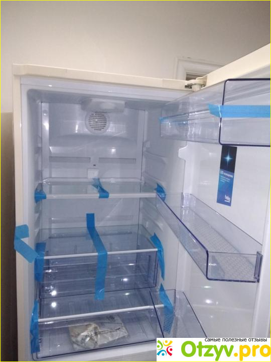 Этот холодильник оснащён автоматической разморозкой No frost. В переводе термин означает "нет мороза". Охлаждение морозильной и холодильной камер осуществляется посредством циркуляции воздуха из вентиляторов. По задней стенке холодильника также выделяется конденсат, но его намного меньше, чем в нашем старом холодильнике, в котором была капельная система.