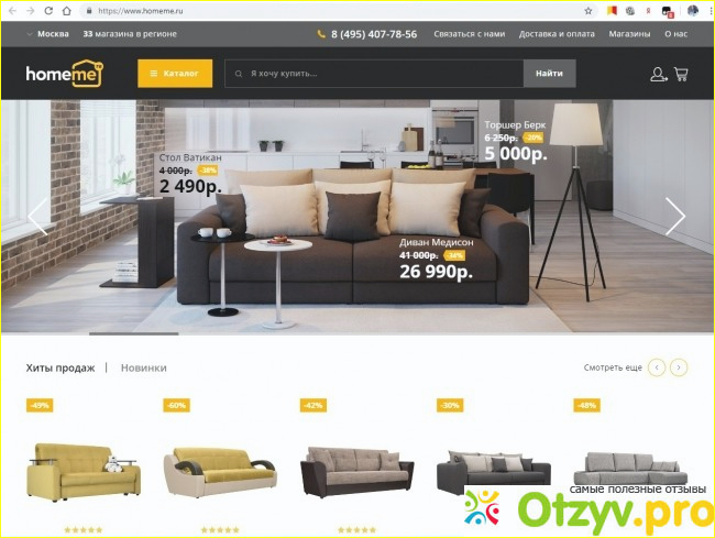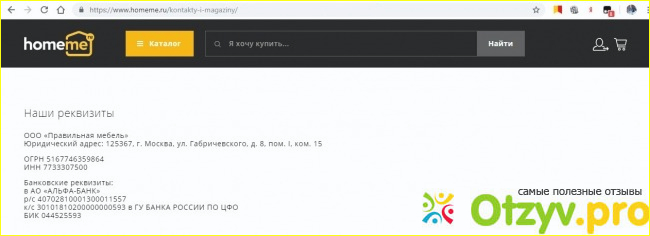 Официальный сайт интернет-магазина "HomeMe мебель" удобен в пользовании, здесь представлена вся необходимая информация о мебели, способах доставки, оплаты, сборки. Компания имеет сеть магазинов в московском регионе и в России, а также огромный шоу-рум в Москве. На сайте имеются телефоны, юридический адрес и реквизиты компании. Компания дает гарантию на мебель, обслуживание клиентов, возврат денег. Компания "HomeMe мебель" – реальная, не развод и не обман.