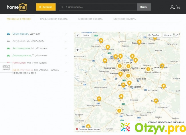 На официальном сайте "ХоумМи мебель" размещена информация о торговых точках компании и контактах. Имеется список из 33 магазинов, размещенных в Московском регионе с указанием ближайших станций метро. Кроме того, для удобства посетителей сайта, все магазины указаны на карте. Если кликнуть на название торгового центра, указанного рядом со станцией метро, то откроется еще больше информации: адрес местонахождения магазина, время его работы, контактный телефон и отображение данной торговой точки на карте. А на станции метро “Семеновская” в ТЦ “Строительный комплекс” можно воочию увидеть огромный выбор мебели в шоу-руме (выставочном зале) компании.