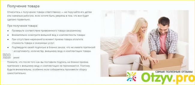 В данном разделе сайта имеется очень полезное, на мой взгляд, предупреждение о том, что необходимо ответственно подойти к получению товара и не доверять его детям и другим незаинтересованным людям. После того, как поставлена подпись в бланке заказа, претензии по внешнему виду и комплектации не принимаются.
