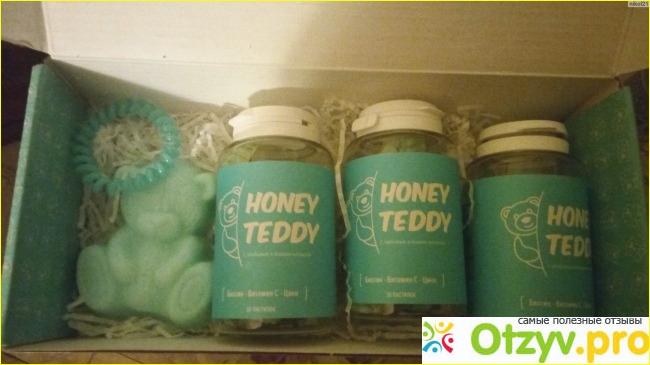 Заказ в Санкт-Петербург доставили достаточно быстро, доставка была на дом курьером. И мне не нужно было стоять в очереди на почте, что не менее удобно. Сразу же открыв коробку, я увидела 3 банки с витаминами, но что мне еще понравилось, так это то, что производитель положил в качестве подарка резинку для волос и мыло в виде такого же мишки. Мелочь, а так приятно.