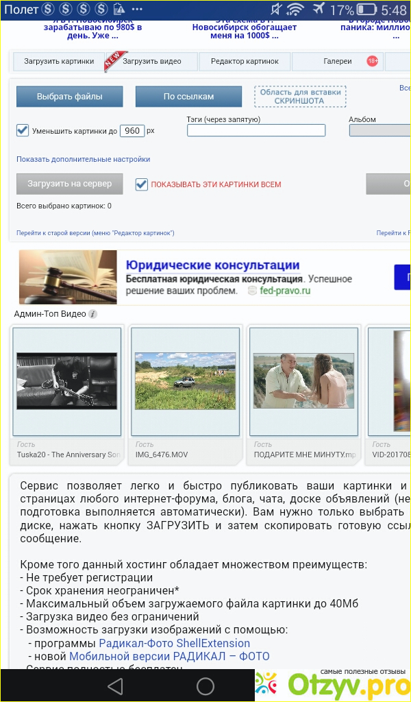 Пришлось снова переделывать. Заходить на сайт радикал, делаем снова, нагружать документ, и снова появилась реклама, на которую нечайно нажала и поехало все заново. И так знаеие, несколько раз. На самом деле это сильно много занимает времени. И если, к примеру, ты рвботаешь в интернете, и у иебя в задании нужно загрузить скриншот, который ты сделал, чтобы доказать работодател о выполнении работы своей. То получается, если на другом хостинге быстро получаеься выполнить, примерно затрачивается всего около пятнадцати или двадцати секунд на загрузку документа, или скриншота, иличто фотографии то наесть сайте радикал, надо от тридцати секунд и выше по времени. Вывод, неудобно. Хотя, бывают дни, что работает этот сайт отлично, без рекламы всякой. Только это так бывает крайне редко, что потеряв свое драгоценное время на загрузку важного документа, а лн не загрузился из -за рекламы, бывает очень неприятно. Поэтому за хостинг радикал я поставила четыре. В остальном, он хороший. Изображения получаются четкими, ссылки все работают при открытии.