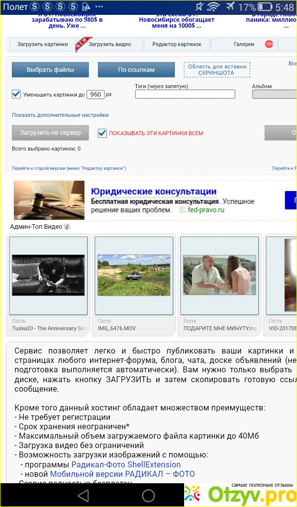 Один из них радикал, но в последнее время я стараюсь им пользоваться как можно меньше. Сейчас поясню, почему. Ну, во-первых, огда открываем сам сайт, кроме загрузить, появляется куча рекламных отступлений, например как плхудеть, как сдать экзамен на пять, что нужно делать, чтобы похудеть быстро. Иногда можно заинтересоваться чем то, и конечно же открыть, и забыться, что нужно нам загружать. И все, работа насмарку. Иногда бывает, что выскаивает казино и загружается, включается, и все. Потом даже, если удалось загрузить нам документ или фотографию, то может при загрузки этого казино или другой игры, или как быдо у меня в последний раз, загрузился ролик, как похудеть. Я конечно же быстро вышла, закрыла эту вкладку, и все видимо и радикал сам тоже завис.