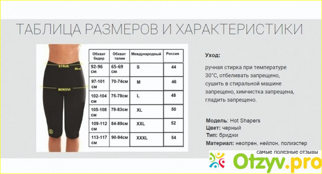 На сайте имеется таблица размеров и характеристик, потому очень удобно подобрать шорты для себя правильно. А это очень важно, ибо, если выберешь слишком большие, они будут на тебе висеть, и, соответственно, ни на какой эффект сауны больше можно не рассчитывать.