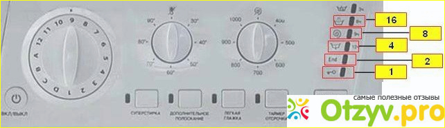 На панели управления расположены: кнопка включения , выключения, питания , а также паузы при стирке. При включении паузы, кнопка индикатора будет медленно мигать. В процессе паузы вы можете менять программу на иную или запускать новые параметры. Чтоб выключить стиральную машинку в момент стирки следует нажать на кнопку питания и подержать дольше обычного. При выборе нужной программы загораются индикаторы. Для выбора программы нужно повернуть регулятор на нужную цифру. Всего их 16. Есть также регулятор выбора температуры воды при стирке. Максимально это 90 градусов. Но можно стирать и в просто в холодной воде. Также вы можете выбрать режим сушки, температуру машинка выберет в зависимости от программы, а дальше можете выбрать и сами, можете отказаться от сушки вообще. А можете сушить по времени, от 40 минут до 3 часов. Есть также дополнительные кнопки, это выбор отжима, супер втирки, но при этом выборе стирки потребляется больше воды и занимает больше времени, также есть дополнительное полоскание для людей с повышенной чувствительностью кожи к остаткам моющих средств. Но многие режимы машинка блокирует сама. И если вы нажимаете кнопку а она загорается и тухнет, значит при выбранной программе дополнительно уже нельзя добавить специальные функции. Часто машинка ограничивает функцию отжима. А также замечательное новшество отсрочка старта. Вы можете отложить стирку до 9 часов. И стирать например ночью, когда элетроэнергия дешевле. Отложить можно и стирку, и отжим , и сушку. Вынимать вещи можно будет только при мигании индикатора ключ. До этого дверца будет заблокирована. Во время стирки вы можете наблюдать за процессом стирки. 6 индикаторов показывают все этапы стирки в реальном времени. Каждая программа, а их 16, сама автоматически устанавливает температуру, отжим и сушку. Даже если вы включите большую температуру, она не отреагирует, в принципе как и на все остальные ваши действия.